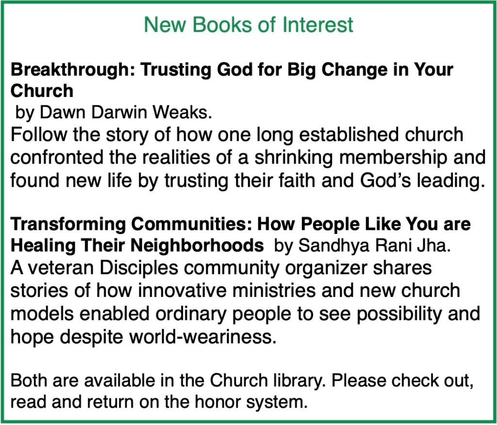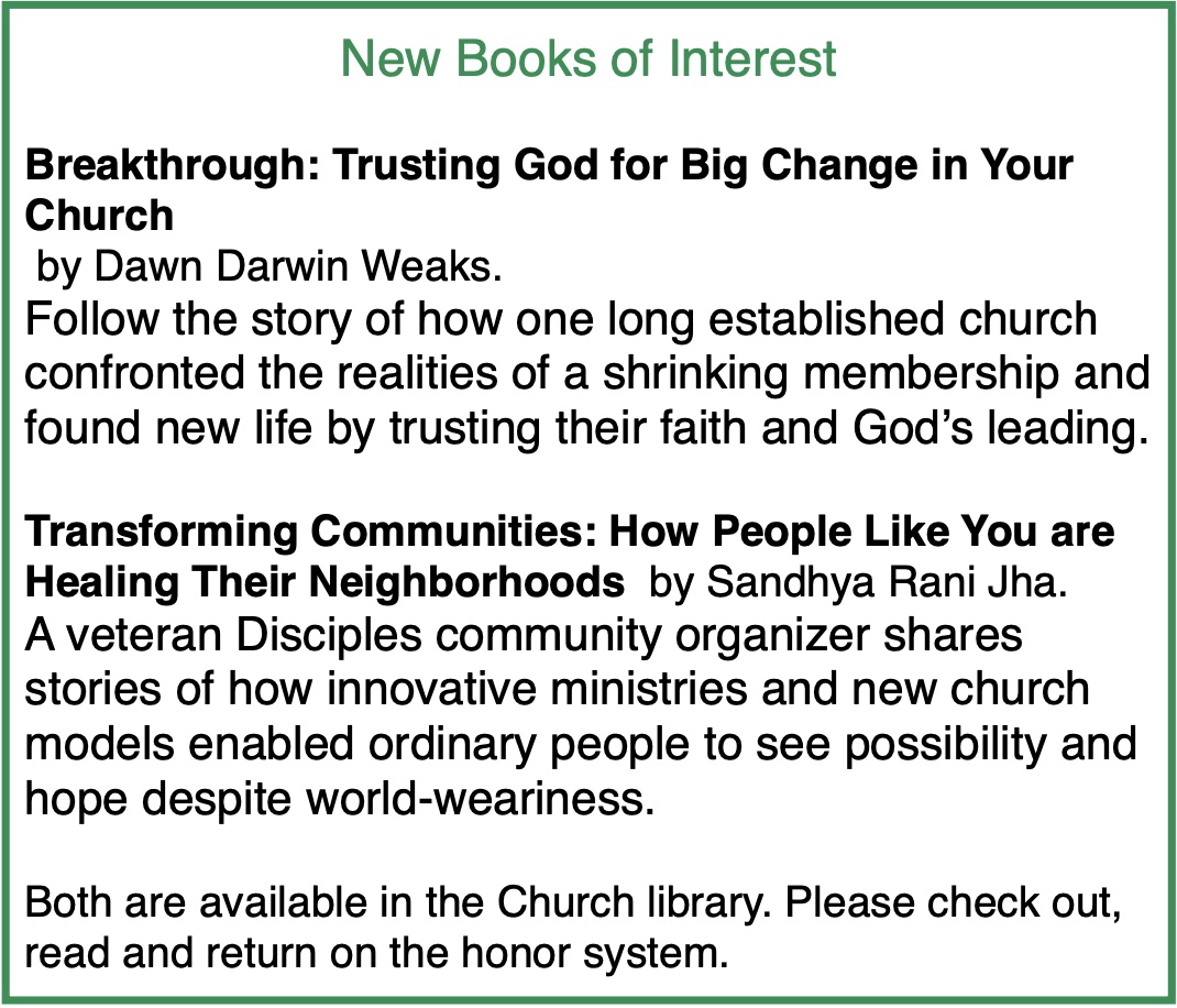 - Disciples 101 beginning Sunday, Sept. 10 at 10:00 a.m., Library Spirit Bloom on Zoom Mondays at 7 p.m.