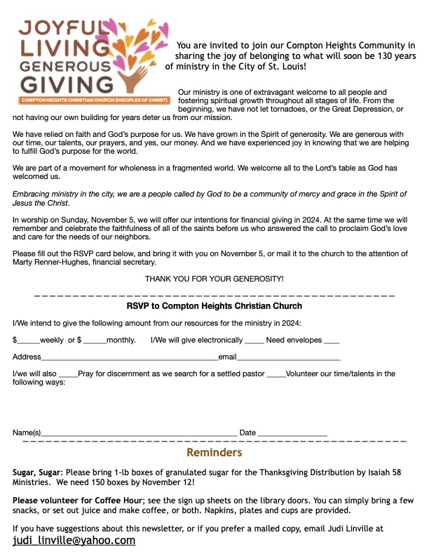 As our intentional interim period with Rev. Steve draws to an end, many of us may have questions about what the next phase of the interim/settled pastor search is going to look like. On Sunday, November 12, moderator Leslie Latham and other members of the board will facilitate an informational session after church during an extended coffee hour/light lunch in the library. Please plan to stay after worship and participate as we look ahead to 2024.