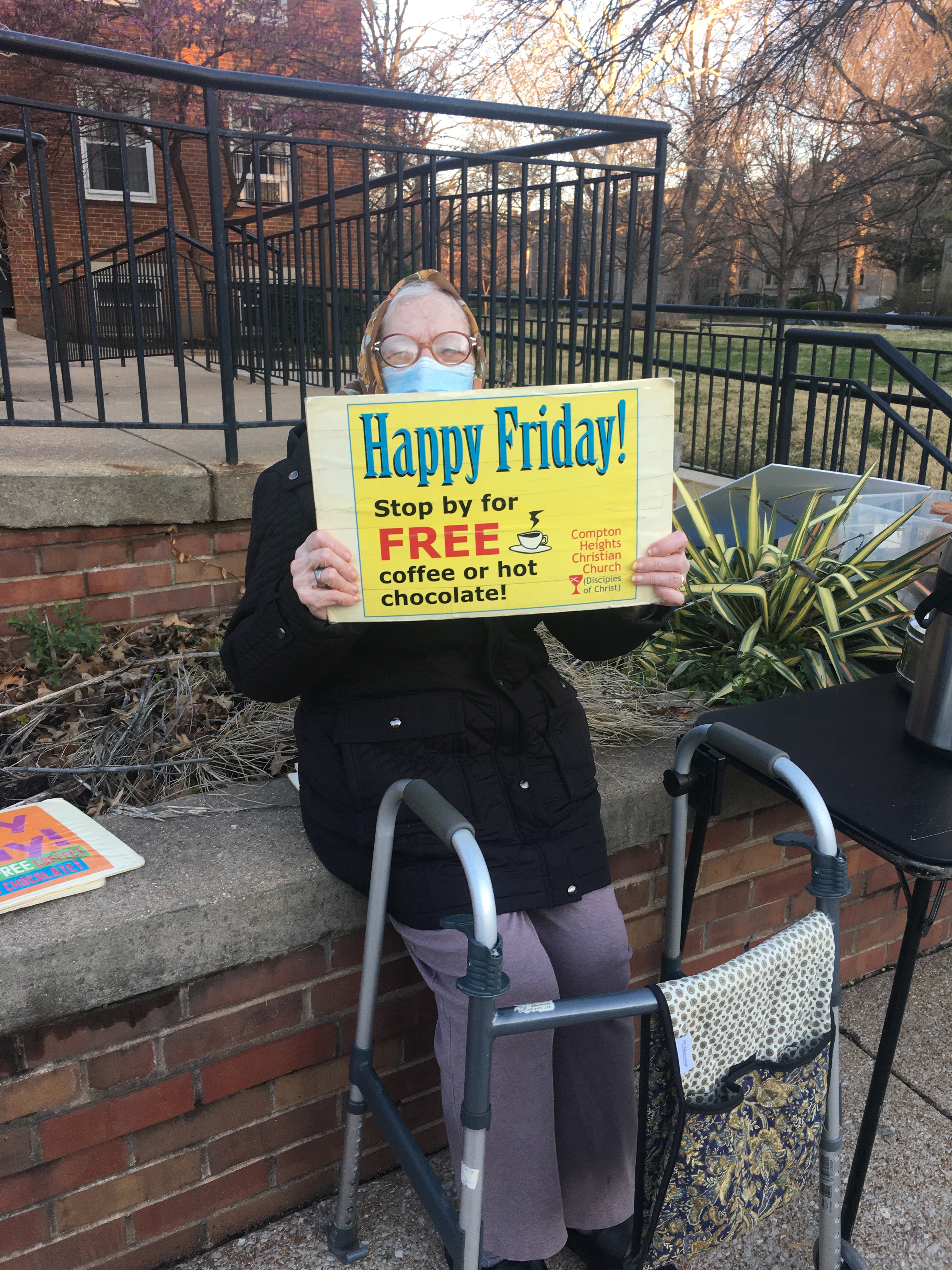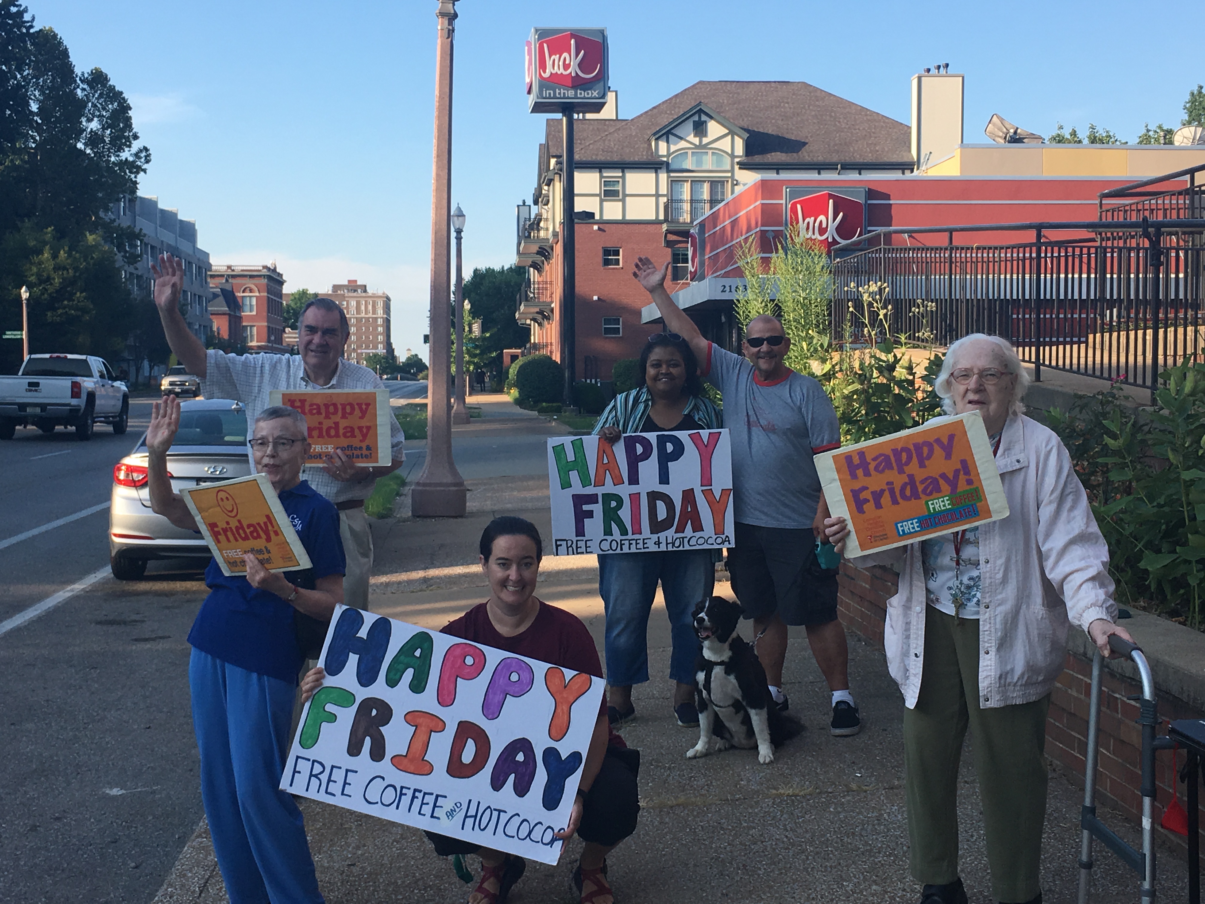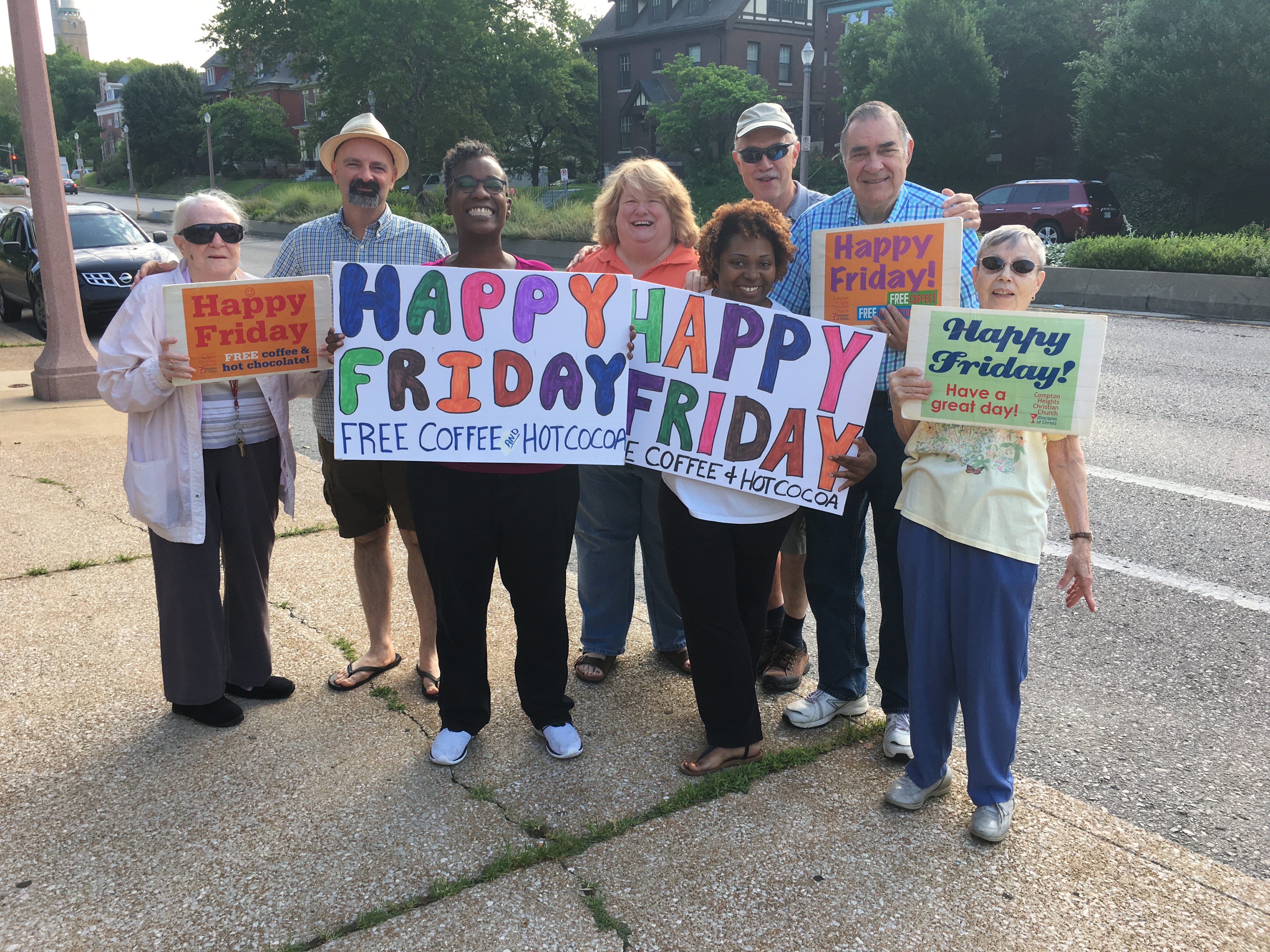 Back in 2004, Madeline Haraway was looking for a devotional to share with the Elders when she read a blog of a UCC pastor in Renton, WA who went out at 6 am on Friday’s and stood a busy road to wave at passing cars and offer free coffee. At the time we had been thinking about how to connect with our neighbors and this ministry inspired us – we said “we can do that” , followed pretty quickly by – “We can start a little later, can’t we?”