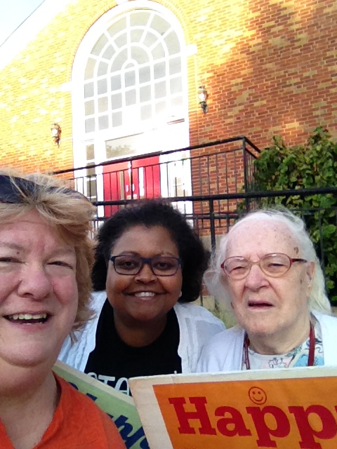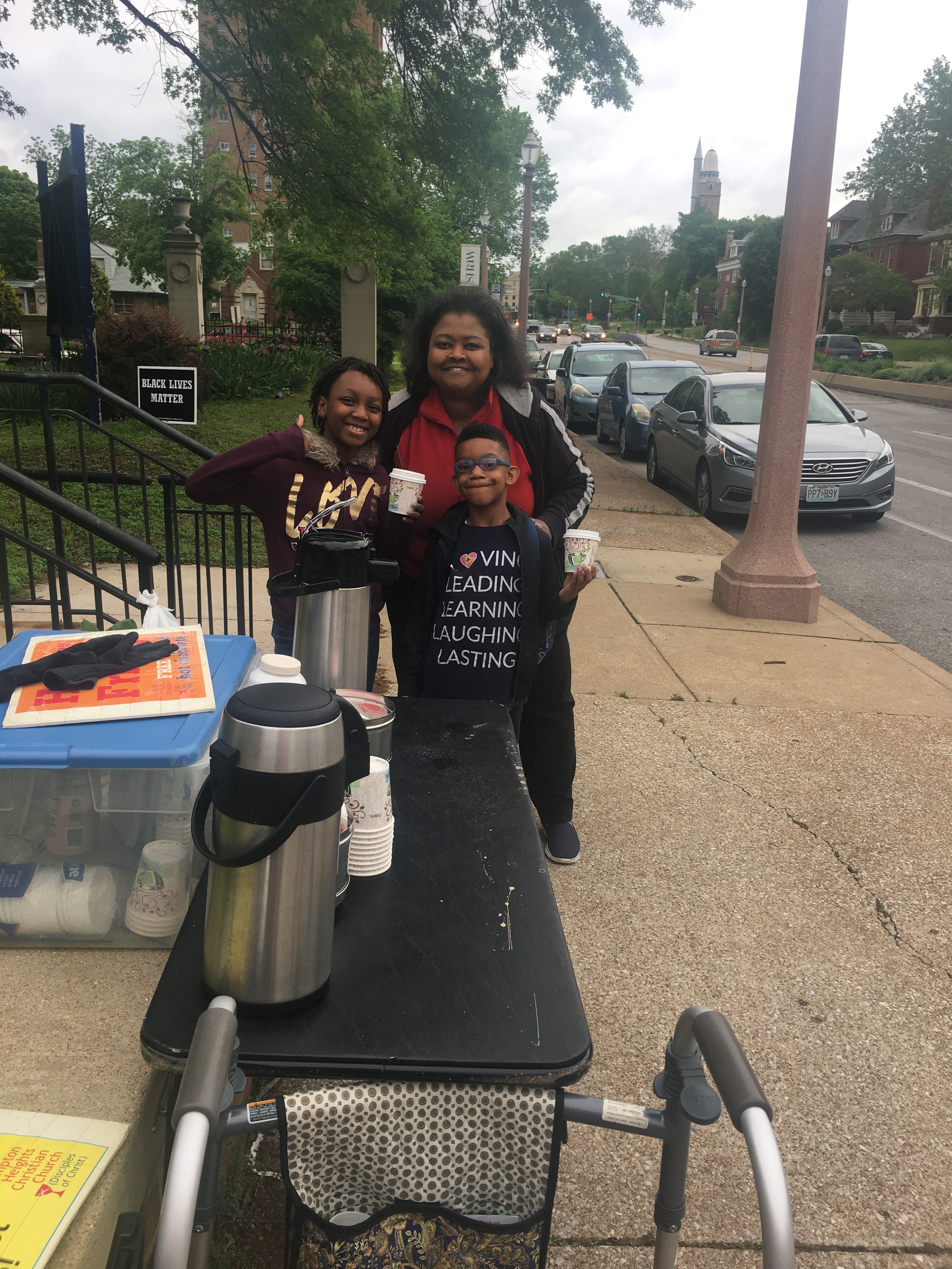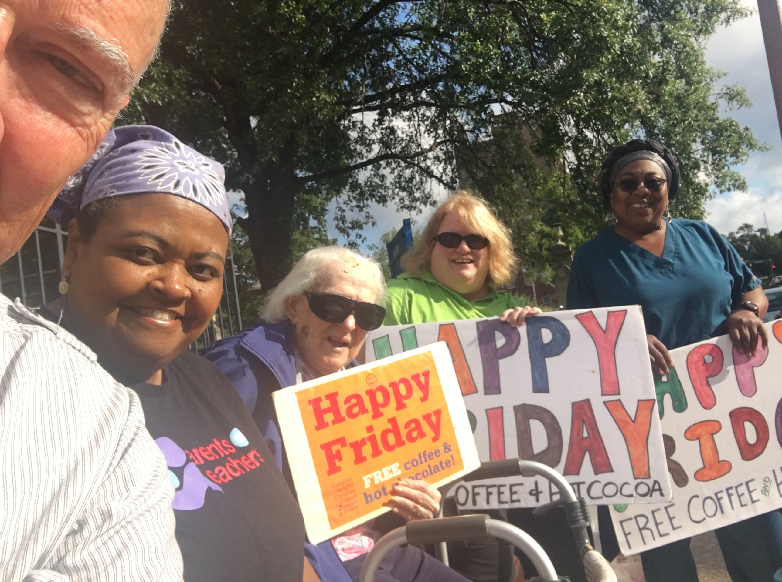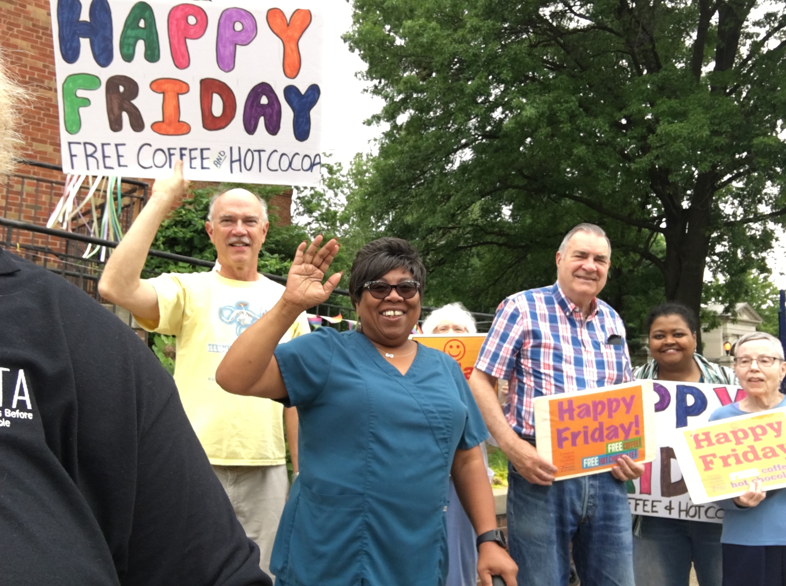 Back in 2004, Madeline Haraway was looking for a devotional to share with the Elders when she read a blog of a UCC pastor in Renton, WA who went out at 6 am on Friday’s and stood a busy road to wave at passing cars and offer free coffee. At the time we had been thinking about how to connect with our neighbors and this ministry inspired us – we said “we can do that” , followed pretty quickly by – “We can start a little later, can’t we?”