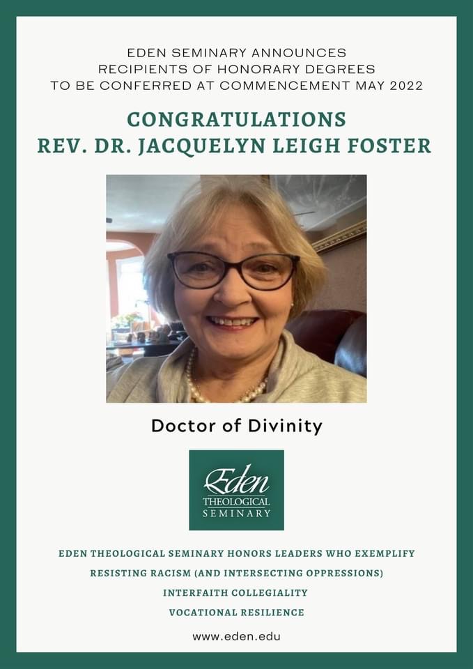 The Rev. Dr. Jacquelyn Leigh Foster is a Doctor of Divinity honorary degree recipient. “Rev. Dr. Foster has not only been an exemplary citizen of Eden’s CE program, she is an exemplary progressive Christian leader in the Seminary’s network.” This degree honors her as a leader who “exemplifies resisting racism (and intersecting oppressions), interfaith collegiality, and vocational resilience.”