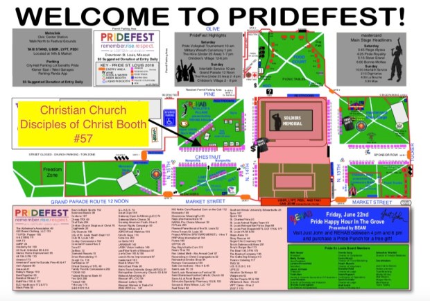 See below for a map of Downtown PrideFest – the Christian Church Disciples of Christ booth is #57 and located on the North side Chestnut between 14th Street and 15th Street. This is a correction to earlier posting. Earlier posting indicated our booth was #76.